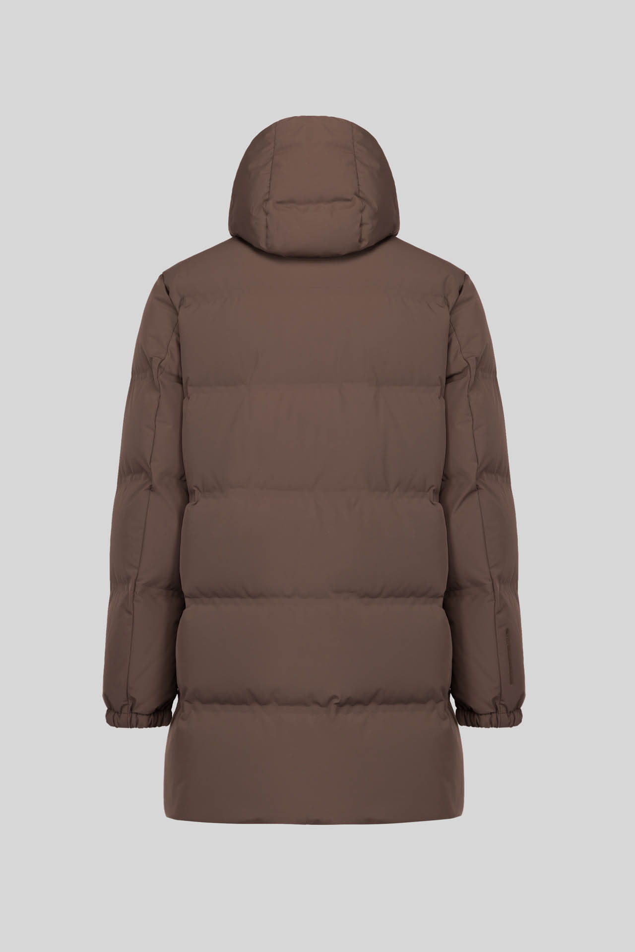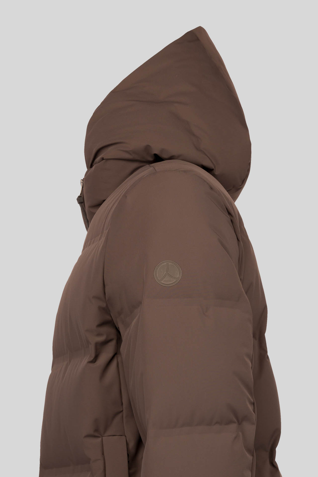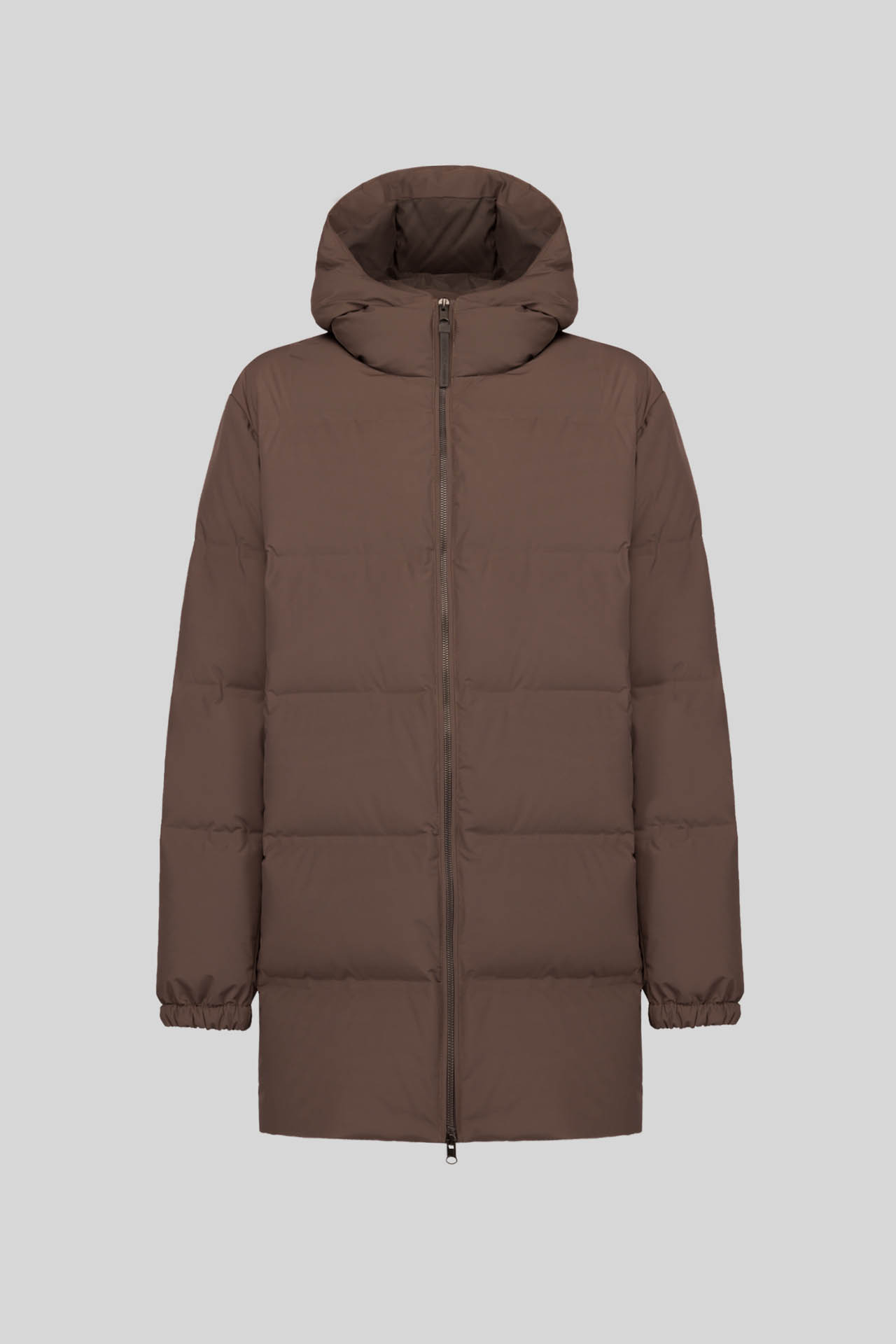 - Long quilted down coat in two-layer stretch nylon with membrane, featuring 90/10 down filling.